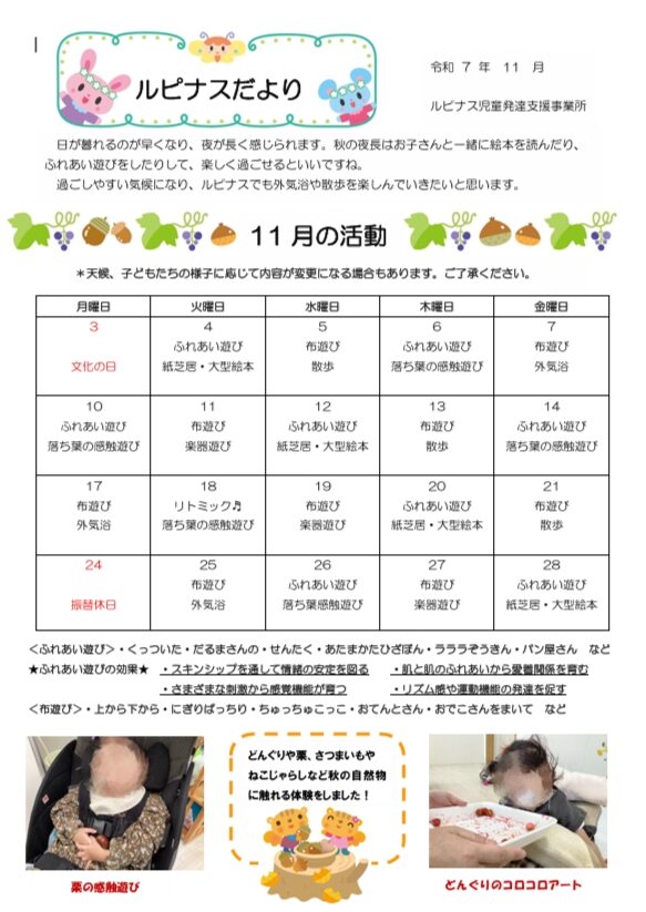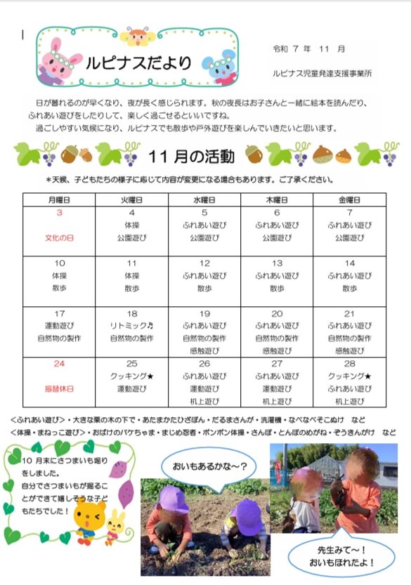 お知らせ 10月のプログラム 2025-10-02 universe.2024 https://lupinus.universe111.net/wp-content/uploads/2023/08/LUPINUSLOGO.png ルピナス児童発達支援事業所
